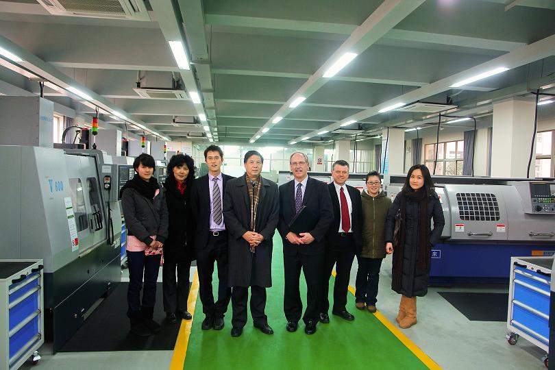 2012年2月23日, 加拿大Trinity Western 大學(xué)兩位副校長(zhǎng)來(lái)我校做交流訪問(wèn)。圖為院長(zhǎng)杜飛龍、院長(zhǎng)助理張沈、國(guó)際交流處長(zhǎng)張佩莉等與來(lái)賓在我院數(shù)控實(shí)訓(xùn)中心合影留念