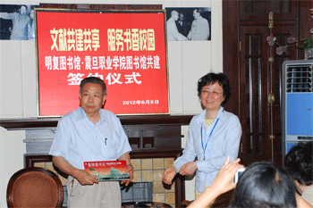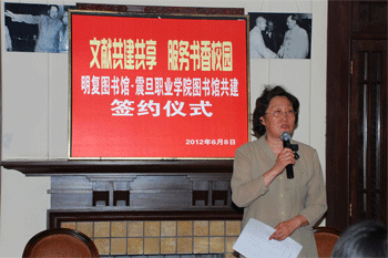 震旦職業(yè)學(xué)院圖書館與黃浦區(qū)明復(fù)圖書館共建簽約儀式于六月八日下午在明復(fù)圖書館會(huì)心樓舉行,震旦教育集團(tuán)董事長(zhǎng)張惠莉出席簽約儀式并熱情致詞。