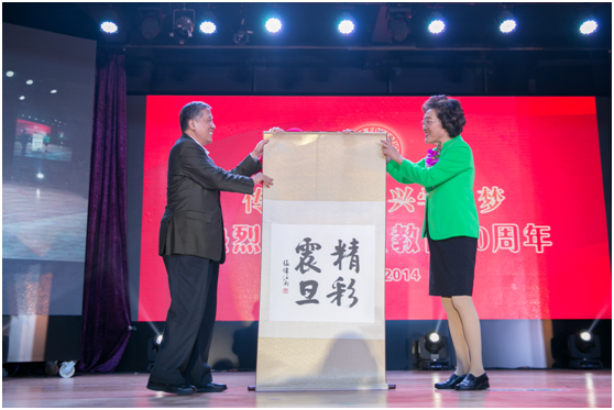 原上海市教委主任張偉江向“震旦教育”集團(tuán)董事長(zhǎng)、管委會(huì)主任張惠莉贈(zèng)送墨寶“震旦精神”祝賀震旦教育三十周年。