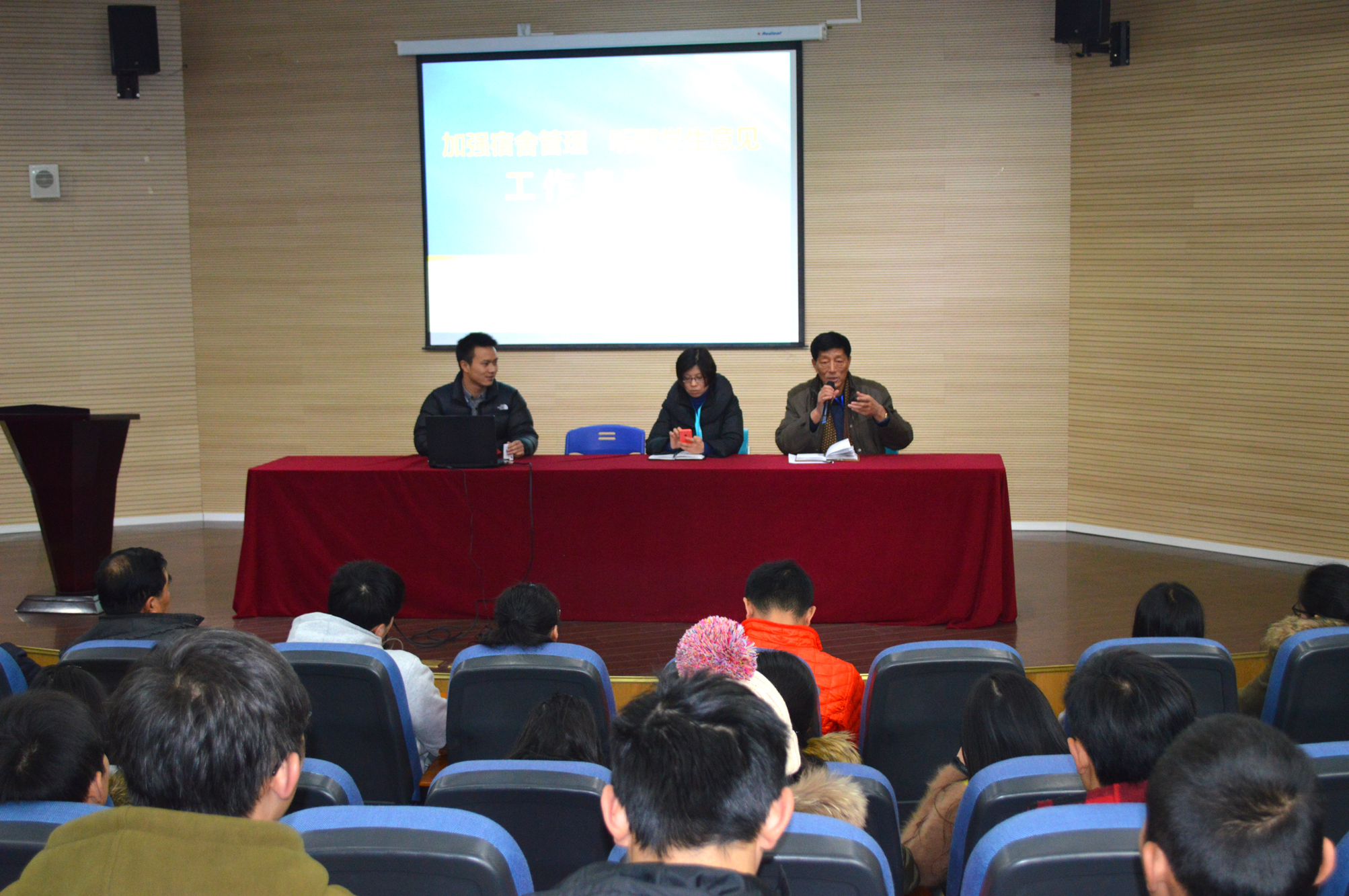 2015 年1月14日下午,在學(xué)校會(huì)議中心報(bào)告廳由校后勤保衛(wèi)處與學(xué)生處聯(lián)合召開以“師生互動(dòng)、強(qiáng)化管理、規(guī)范用電、確保平安 ” 為主題的強(qiáng)化宿舍管理的師生互動(dòng)會(huì),旨在聽取學(xué)生如何進(jìn)行自我管理,規(guī)范用電,安全用電的意見和建議,提供一個(gè)師生互動(dòng)的交流平臺(tái)。后保處、學(xué)生處相關(guān)老師和各班級(jí)學(xué)生代表參加了這次互動(dòng)交流會(huì)。