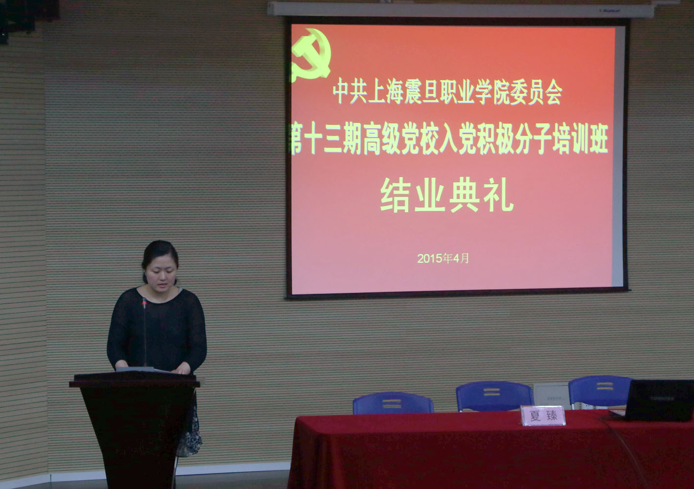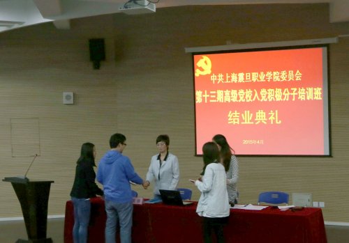 2015 年4月 29 日下午,上海震旦職業(yè)學(xué)院第十三期高級(jí)黨校入黨積極分子培訓(xùn)班結(jié)業(yè)典禮在體藝樓報(bào)告廳隆重舉行,有75名學(xué)員順利結(jié)業(yè)。