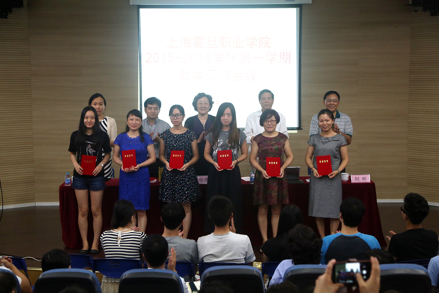 會(huì)議由院長(zhǎng)助理張沈宣讀了 2015 年職業(yè)技能競(jìng)賽的獲獎(jiǎng)名單,獲獎(jiǎng)師生在全體教職工熱烈的掌聲中上臺(tái)接受了院領(lǐng)導(dǎo)頒發(fā)的榮譽(yù)證書。他們是獲得 2015 年全國(guó)職業(yè)院校技能大賽高職組“電子商務(wù)技能”選拔賽團(tuán)體二等獎(jiǎng)、全國(guó)職業(yè)院校技能大賽上海賽區(qū)“聚文杯”電子商務(wù)技能選拔賽團(tuán)體一等獎(jiǎng)和三等獎(jiǎng),上海市“星光計(jì)劃 ” 職業(yè)技能競(jìng)賽非英語專業(yè)口語比賽三等獎(jiǎng)、平面設(shè)計(jì)比賽三等獎(jiǎng)、網(wǎng)站設(shè)計(jì)比賽三等獎(jiǎng)的學(xué)生和教師。以及第四屆院科技節(jié)項(xiàng)目比賽獲一、二、三等獎(jiǎng)的學(xué)生和科技節(jié)組織獎(jiǎng)的學(xué)院。會(huì)上還頒發(fā)了優(yōu)秀園丁獎(jiǎng)和師德標(biāo)兵獎(jiǎng)。