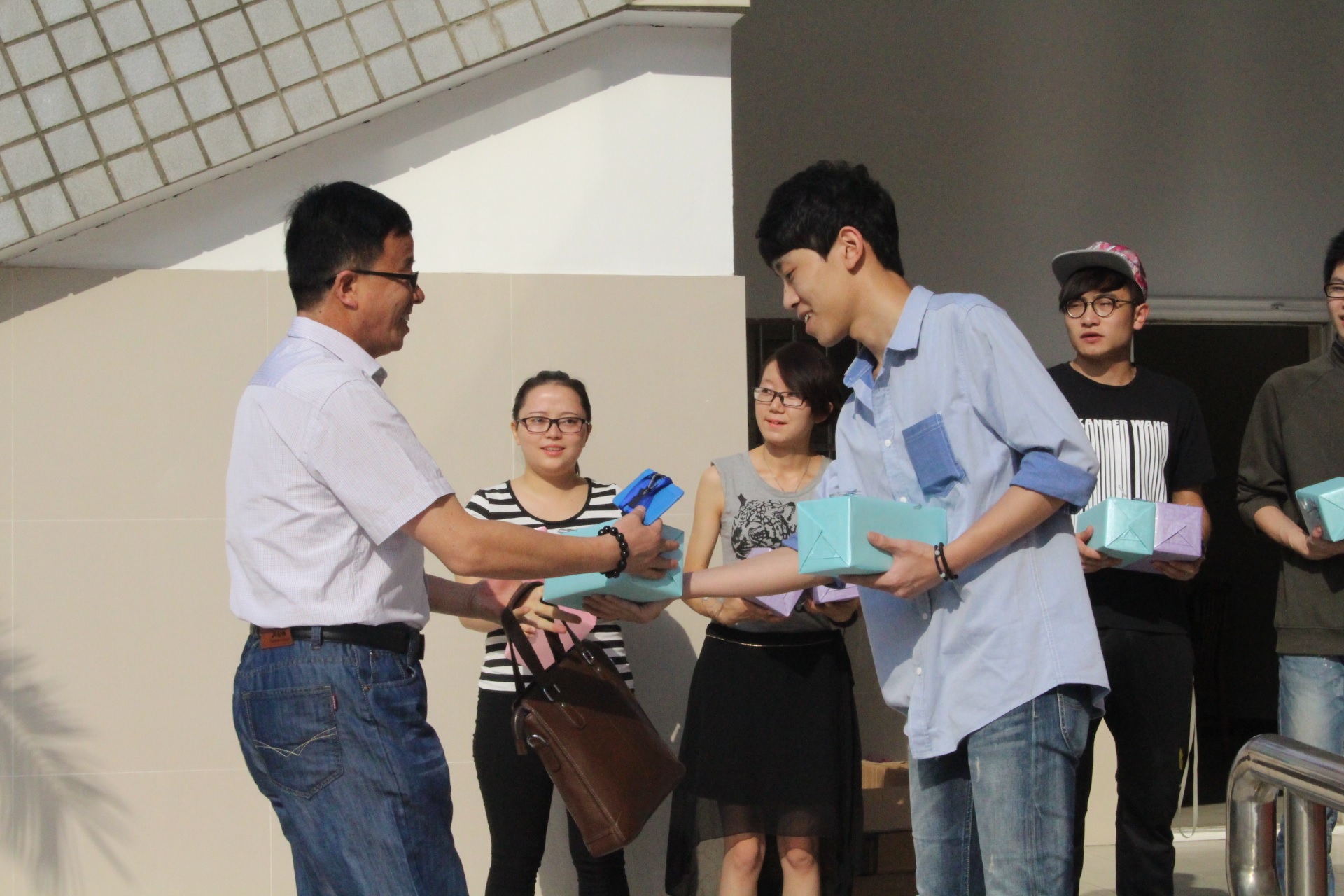 上午8點,學(xué)生代表們早早就在教學(xué)樓的門口等待老師們的到來,為老師獻(xiàn)上祝福的禮物。筆筒貼上祝福的話語,經(jīng)過同學(xué)們精心包裹,親手送給老師,禮輕卻情意重。老師們收到這些禮物的時候,都不由自主地流露出燦爛的笑容。