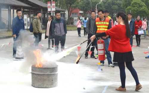 疏散演練結(jié)束后,又組織師生參加了消防滅火演練。來自寶山羅店消防中隊的趙教官為大家詳細介紹了二氧化碳和干粉滅火器的性質(zhì)并現(xiàn)場示范兩種滅火器的使用方法。參加消防滅火演練的師生和后勤的工作人員(宿管、保潔)分成15個組,每組師生按照操作示范,提著滅火器沖到離火焰約3米處,對準著火點進行高壓噴射,火很快就被撲滅。通過親身體驗,師生們基本掌握了滅火器的使用方法。