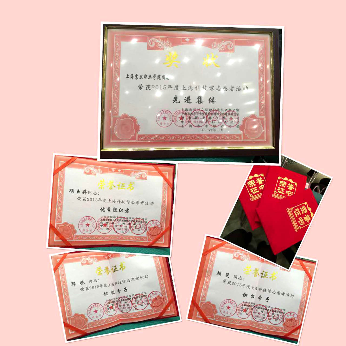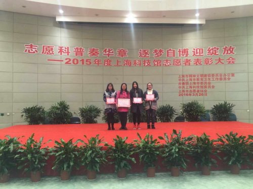 表彰會(huì)上,我校團(tuán)委被授予“2015年度上??萍拣^志愿者活動(dòng)先進(jìn)集體”,項(xiàng)玉婷同學(xué)被授予“2015年度上海科技館志愿者活動(dòng)優(yōu)秀組織者”稱號(hào),社會(huì)實(shí)踐部鄔艷同學(xué)、學(xué)習(xí)部顧斐同學(xué)被授予“2015年度上??萍拣^志愿者活動(dòng)積極分子”稱號(hào)。
