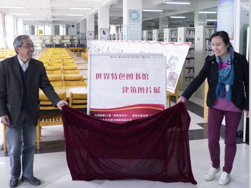 張健館長首先對舉辦圖片展的意義進行了介紹,通過展示世界上獨具特色的20組圖書館建筑,反映出各個地區(qū)對閱讀文化的重視及圖書館建筑文化的發(fā)展,開拓讀者眼界。在熱烈的掌聲中,張沈董事長與張健館長共同為儀式揭牌。