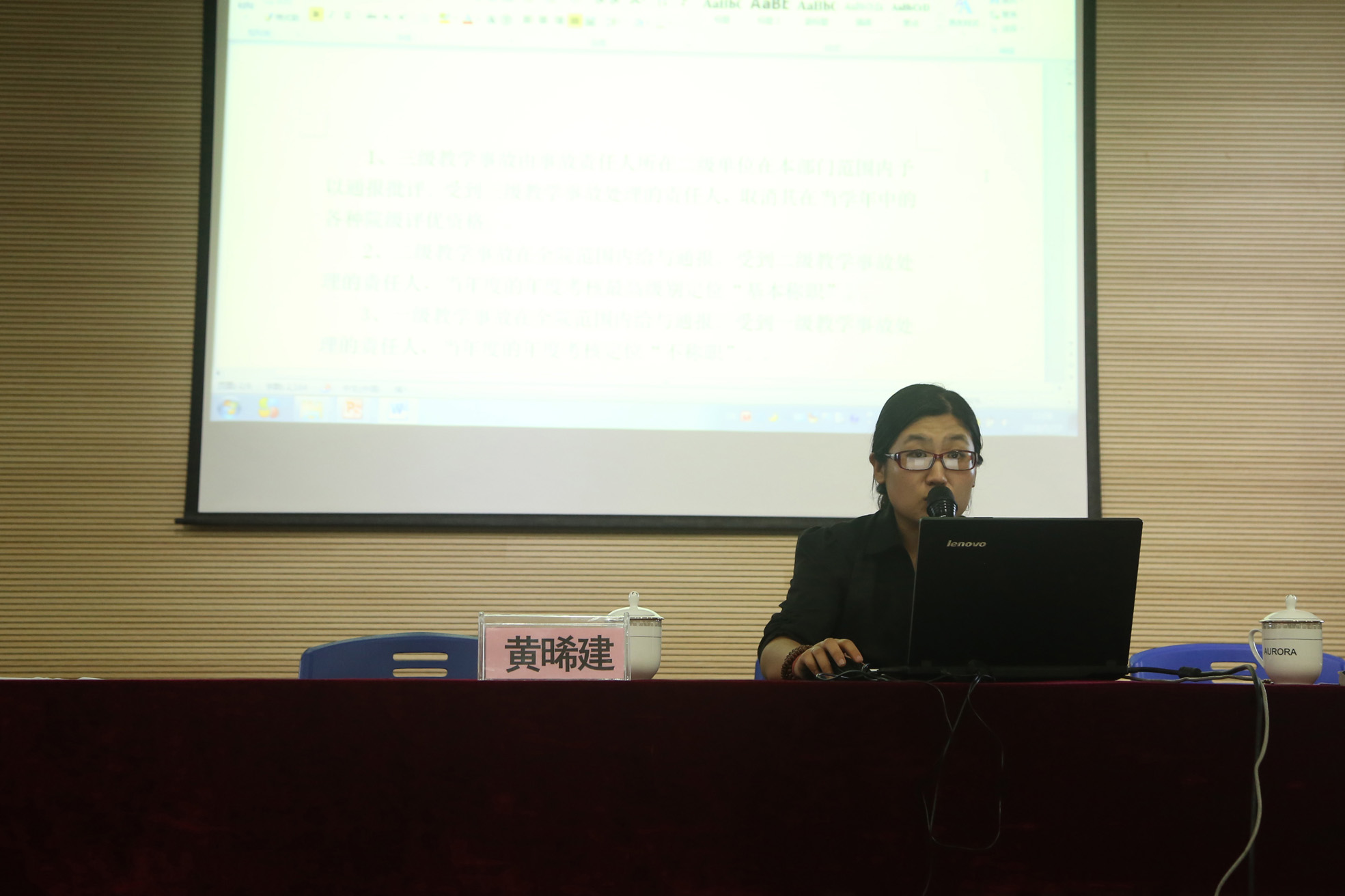 會(huì)議伊始,教務(wù)處張瑩副處長(zhǎng)作“加強(qiáng)制度建設(shè)、規(guī)范教學(xué)管理”的匯報(bào),梳理了學(xué)院現(xiàn)有教學(xué)管理文件,經(jīng)過(guò)此次修訂和新增共有43個(gè)文件,從學(xué)籍管理、課務(wù)管理、考試管理、教材管理、教學(xué)質(zhì)量監(jiān)控與評(píng)價(jià)、教研課改、實(shí)踐教學(xué)等規(guī)范教育教學(xué)全過(guò)程,切實(shí)做到教育教學(xué)管理有“章”可循,有“法”可依。