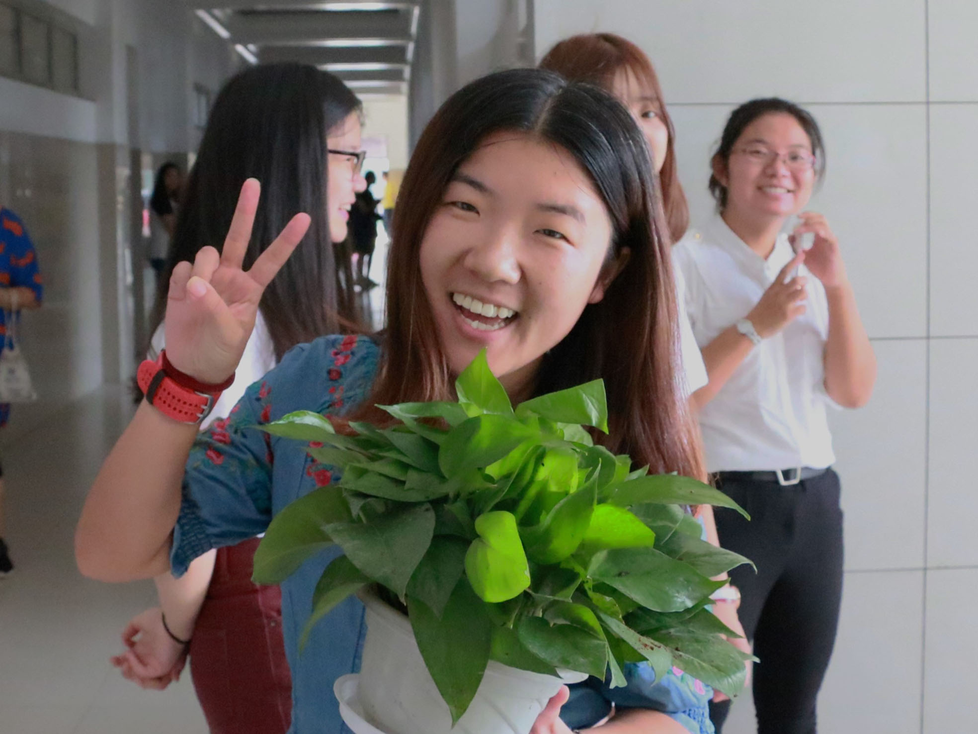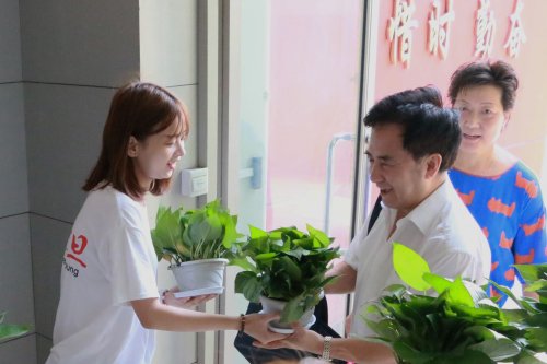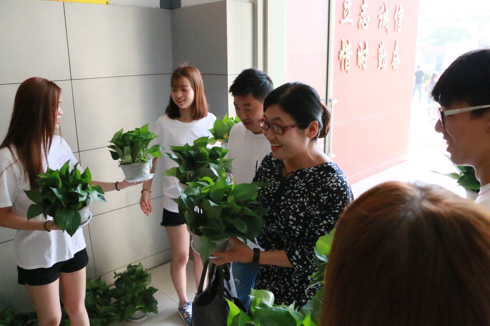 早上七點(diǎn)半,團(tuán)委學(xué)生會(huì)的同學(xué)們穿上統(tǒng)一的著裝,手捧綠蘿排成兩列整齊的站在了校門口,為每位到校的老師送上一份禮物:“老師教師節(jié)快樂,老師您辛苦了?!币痪淇此坪唵蔚膯柡?,一份并不算貴重的禮物,卻代表著全體震旦學(xué)子的心意,溫暖著我們的老師的心。
