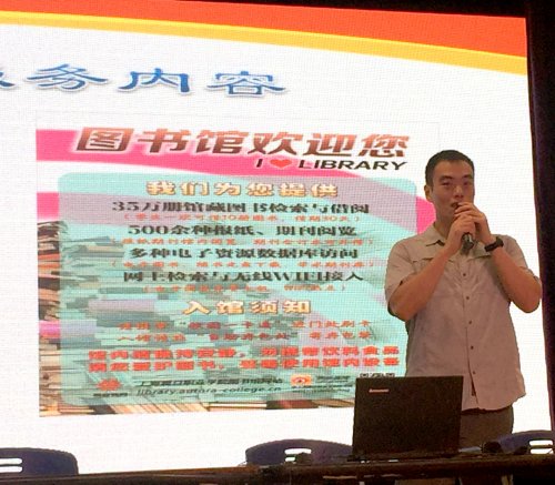 再次,學(xué)院圖書館李斯聰老師為全體新生介紹了圖書館為師生們服務(wù)的內(nèi)容,例如:圖書館的地點、開放時間、服務(wù)內(nèi)容、入館須知、借還書須知以及網(wǎng)上查閱的方式等,并介紹了在學(xué)院官網(wǎng)上查閱各類書籍和資料的方法。