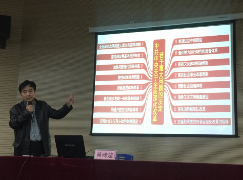 11月10日晚,學(xué)院黨委書記黃晞建教授為我院高級黨校學(xué)員做了《面向未來,你準(zhǔn)備好了嗎?》的主題報(bào)告。報(bào)告深入淺出的對十八大三、四、五、六中全會的邏輯關(guān)系進(jìn)行了講解,并結(jié)合中共中央關(guān)于全面深化改革若干問題的決定和"十三五"規(guī)劃綱要草案中的民生看點(diǎn),從生育政策、教育改革、就業(yè)創(chuàng)業(yè)、城鄉(xiāng)統(tǒng)一的建設(shè)用地、醫(yī)療保障制度、國家產(chǎn)權(quán)保障體制改革等方面進(jìn)行了分析,學(xué)員們受益匪淺。