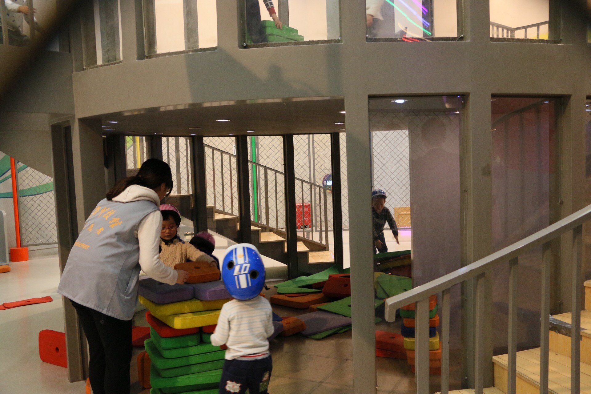 生物萬象展區(qū)出口處的志愿者負(fù)責(zé)疏導(dǎo)人群,指引游客前往下一個參觀地點。彩虹兒童樂園處的志愿者化身守護(hù)天使,負(fù)責(zé)孩子們的安全保障。智慧之光展區(qū)的志愿者則是為游客講解館內(nèi)展品工作原理的小解說員。動感影院的志愿者有條不紊地在門口為前來觀影的游客檢票。