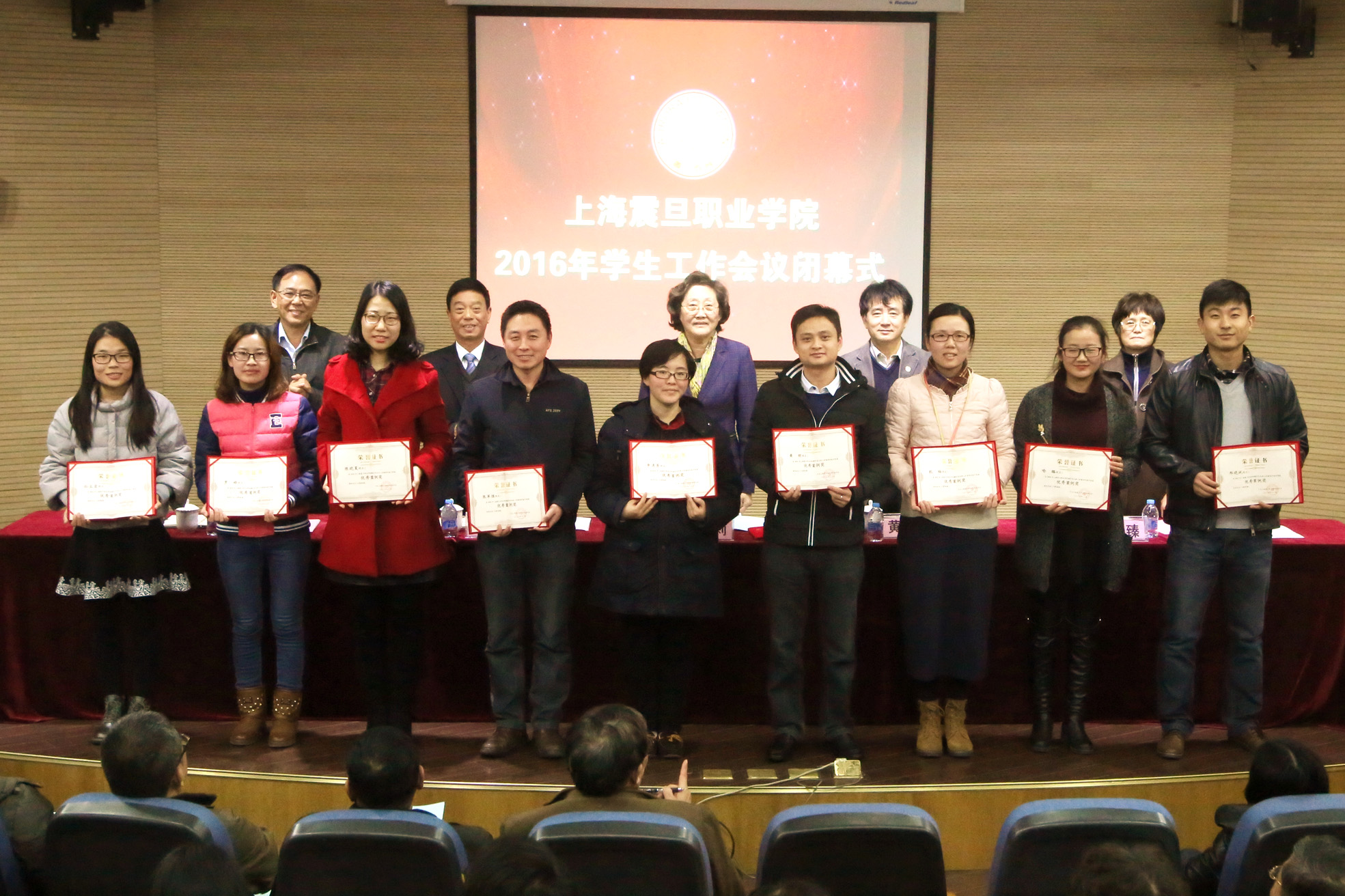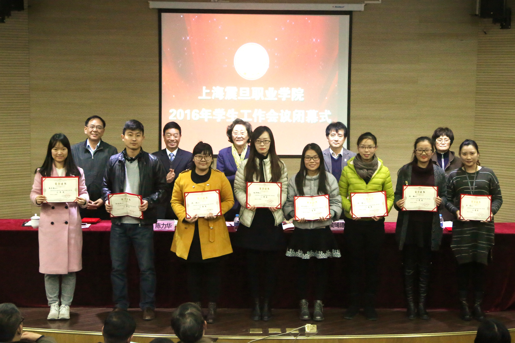 在2016年上海震旦職業(yè)學院學生工作閉幕式上,校領導為獲獎人員授獎。