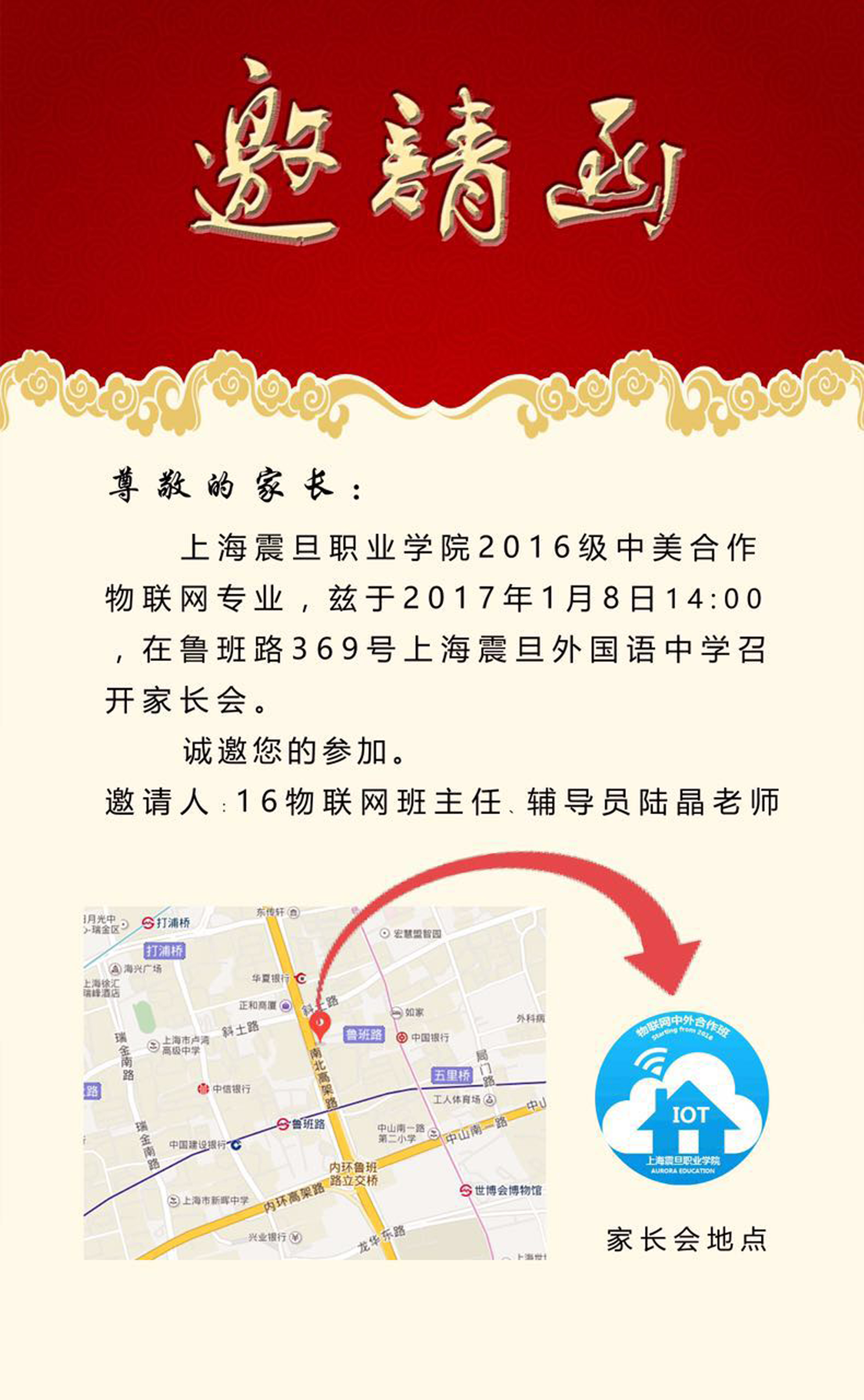 2017年1月8日下午兩點(diǎn),我院16級(jí)物聯(lián)網(wǎng)(中美合作)2016——2017學(xué)年第一學(xué)期學(xué)期第一次家長(zhǎng)會(huì)在上海震旦外國(guó)語中學(xué)召開,雖然天氣陰沉,但是家長(zhǎng)們都如約而至本次家長(zhǎng)會(huì)。上海震旦職業(yè)學(xué)院董事長(zhǎng)張沈,機(jī)電工程學(xué)院副院長(zhǎng)姚黎明出席本次家長(zhǎng)會(huì),會(huì)議還邀請(qǐng)了學(xué)校心理咨詢中心的武瑩瑩老師,會(huì)議由輔導(dǎo)員陸晶老師主持。