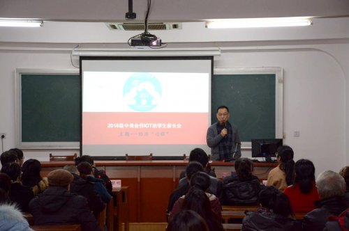 陸晶老師介紹了物聯(lián)網(wǎng)專業(yè)學(xué)生在校期間學(xué)習(xí)生活的基本情況、班徽的含義和班級(jí)微信公眾號(hào)的運(yùn)營(yíng)情況,并分析了本學(xué)期學(xué)生期末成績(jī)以及各科學(xué)習(xí)情況;最后介紹本專業(yè)美國(guó)合作的學(xué)校加州浸會(huì)大學(xué)及后期赴美游學(xué)、留學(xué)準(zhǔn)備工作。
