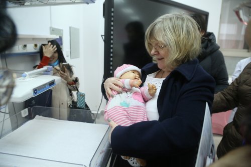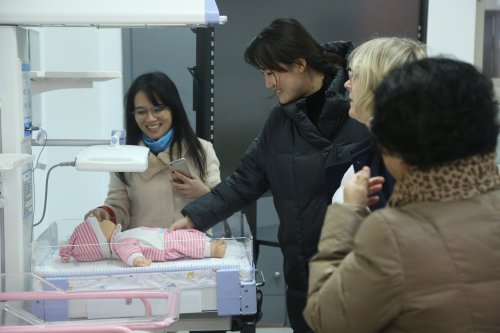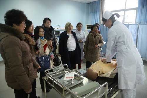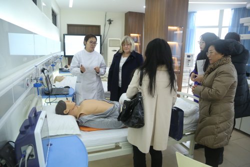 AnnieBarr一行參觀了公共衛(wèi)生與護理學(xué)院實訓(xùn)室和醫(yī)爵教育培訓(xùn)中心,并在模擬人體上親手實踐了心肺復(fù)蘇等醫(yī)療手段,觀看了公共衛(wèi)生與護理學(xué)院學(xué)生示范的人工呼吸等教學(xué)內(nèi)容。