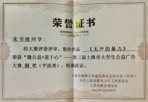 第三屆“微公益,道于心”上海市大學(xué)生公益廣告大賽從2016年3月開(kāi)始,歷時(shí)數(shù)月,到12月份圓滿(mǎn)結(jié)束,這次活動(dòng)在各高校開(kāi)展的如火如荼。最終120幅作品從2000多份作品中脫穎而出。我傳媒藝術(shù)學(xué)院14級(jí)廣告設(shè)計(jì)與制作專(zhuān)業(yè)朱書(shū)晴同學(xué)以“遠(yuǎn)離暴力”為主題思想,精心創(chuàng)作設(shè)計(jì)的《無(wú)聲的暴力》公益海報(bào),在此次大賽中榮獲銅獎(jiǎng)。
