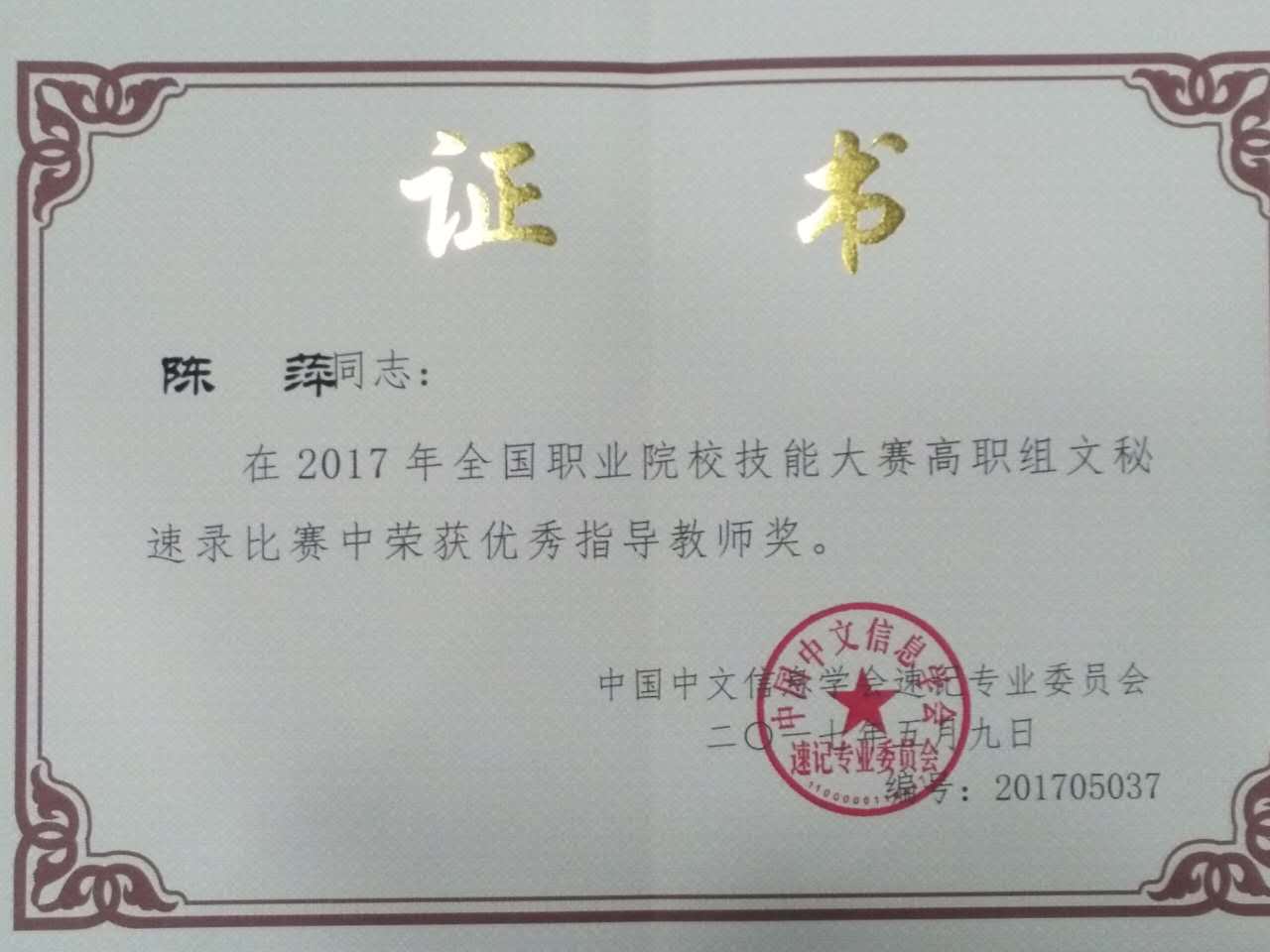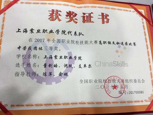 由我校實(shí)踐辦和機(jī)電工程學(xué)院共同組織,實(shí)踐辦主任葉素梅和陳萍老師帶隊(duì)參加第十屆全國職業(yè)院校技能大賽文秘速錄項(xiàng)目競賽,榮獲該賽項(xiàng)團(tuán)體三等獎(jiǎng)!獲獎(jiǎng)學(xué)生為機(jī)電工程學(xué)院的董劍皓和沈躍,傳媒藝術(shù)學(xué)院的支卓爾。指導(dǎo)老師陳萍老師獲得優(yōu)秀指導(dǎo)老師獎(jiǎng)!這次競賽競爭非常激烈,有來自28個(gè)省市69所高職院校的207名參賽選手參賽,速錄高手云集。我校選手發(fā)揮很好,經(jīng)過6個(gè)小時(shí)的拼搏取得好成績,是該國賽項(xiàng)目上海市三所參賽院校中唯一獲得的獎(jiǎng)項(xiàng)。