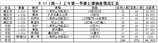 9月11日上午2017-2018學年第一學期正式開學,清晨,領(lǐng)導和老師們就早早地來到了學校做開學的準備工作,迎接新老同學入學;2015級、2016級的同學們也是早早地等候在教室,等待8.30分正式開課。8.20分學校和有關(guān)部處領(lǐng)導們就聚集在會議室,鈴響后張理事長、張沈董事長、陳校長、黃書記、夏書記就帶領(lǐng)有關(guān)部處領(lǐng)導,分四路深入校本部和美蘭湖校區(qū),到教室、實驗室檢查開學第一節(jié)課的上課情況,從檢查的結(jié)果來看,總體上教學秩序井然、課堂紀律良好,老師負責,學生認真,比上學期有顯著進步。具體體現(xiàn)在一是老師們?nèi)跍蕰r上崗,備課充分、認真施教,沒有發(fā)現(xiàn)老師遲到等違紀現(xiàn)象;二是學生們經(jīng)過一個暑假的休息調(diào)整,精神面貌煥然一新,出勤率及紀律都比上學期有明顯提高,平均出勤率在94.9%(詳見下表);