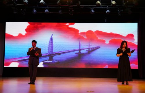 黨委書記黃晞建教授上臺致辭,書記即興創(chuàng)作了一首《震旦喜迎十九大》,充滿激情地朗誦,表達了震旦全體師生慶祝黨的十九大勝利召開的共同心聲!