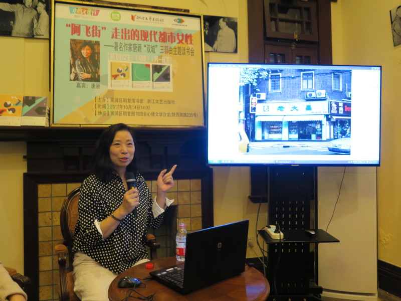 唐穎老師是土生土長(zhǎng)的上海人。她的三本小說(shuō)《阿飛街女生》、《另一座城》、《初夜》就是以她年少成長(zhǎng)的上海街區(qū)作為重要場(chǎng)景來(lái)撰寫的。講座中,唐穎老師圍繞著這三本小說(shuō)講述了她曾經(jīng)年代的故事并展示了珍貴的圖片,通過(guò)述說(shuō)還原了當(dāng)年的時(shí)代面貌。