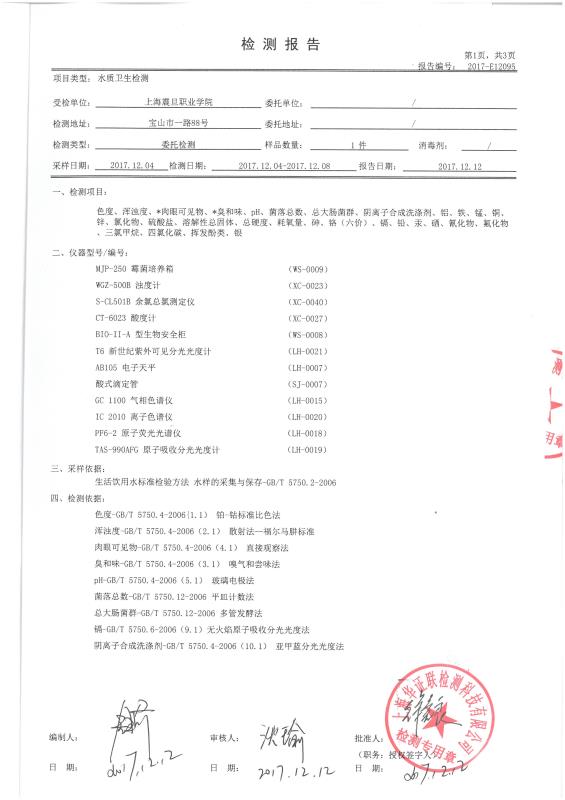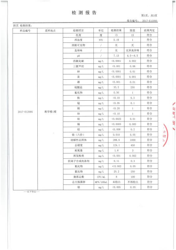為了保障學(xué)校師生飲用水安全問題,由第三方檢測單位對我校飲用水按照國家生活飲用水衛(wèi)生標(biāo)準(zhǔn)進(jìn)行檢測,檢測項(xiàng)目多達(dá)30項(xiàng),具體結(jié)果公布如下: