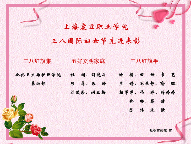 大會首先由王純玉副校長宣讀《上海震旦教育集團(tuán)2017年度“三八”紅旗集體、“三八”紅旗手、“五好”文明家庭獲獎名單》,與會領(lǐng)導(dǎo)為受表彰的先進(jìn)女教職工頒發(fā)榮譽(yù)證書。學(xué)校基礎(chǔ)部袁琨老師和機(jī)電工程學(xué)院陳萍老師分別代表三八紅旗集體和五好文明家庭上臺發(fā)言。