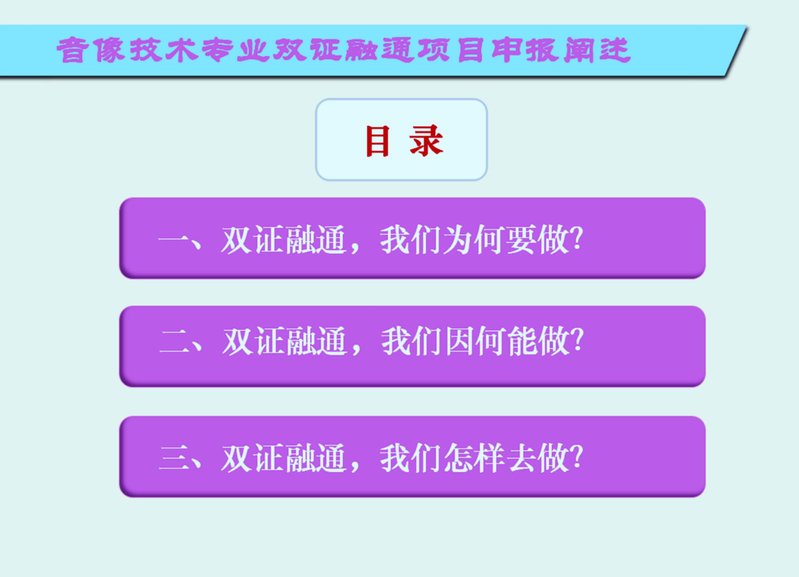 近年來,東方電影學(xué)院不斷進(jìn)行教學(xué)改革,在提高教學(xué)質(zhì)量的基礎(chǔ)上,快速有效推進(jìn)“雙證融通”的進(jìn)程。“雙證融通”的基礎(chǔ)是繼續(xù)深化以任務(wù)引領(lǐng)為主要特征的課程改革,音像技術(shù)專業(yè)課程設(shè)置與內(nèi)容體系近年來也在不斷探索創(chuàng)新,基本上實(shí)現(xiàn)了課程改革的“任務(wù)引領(lǐng)”,為實(shí)現(xiàn)“雙證融通”奠定了重要的課程改革基礎(chǔ),并逐步形成了與職業(yè)資格證書內(nèi)容的對(duì)應(yīng)關(guān)系,具備了將職業(yè)資格證書中的知識(shí)、技能與素質(zhì)等內(nèi)容完全融入專業(yè)教學(xué)中的條件。
