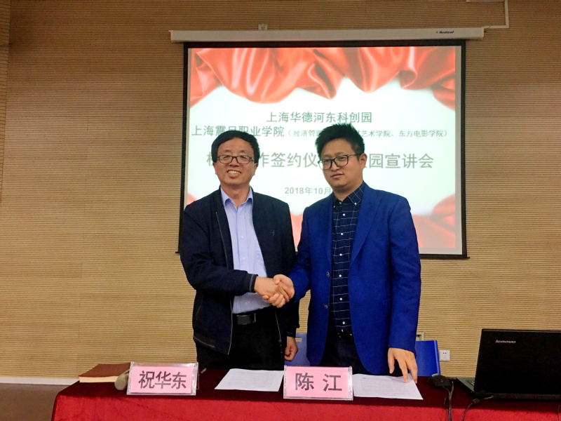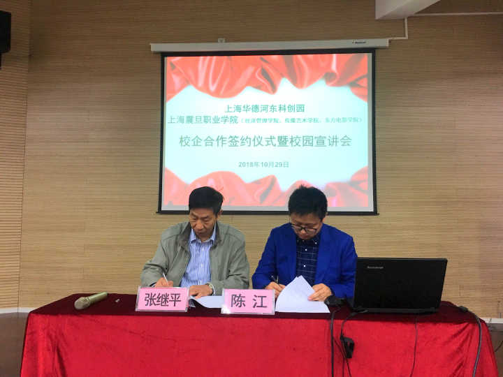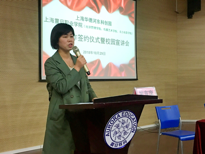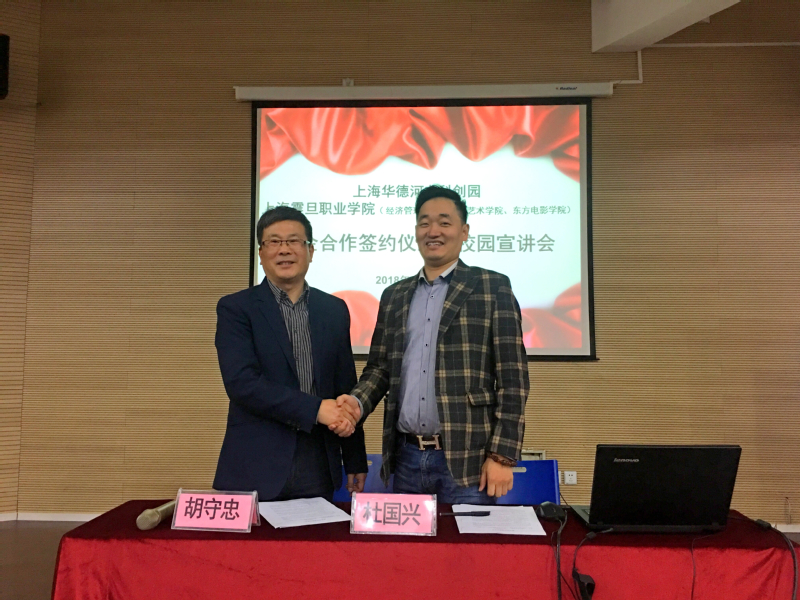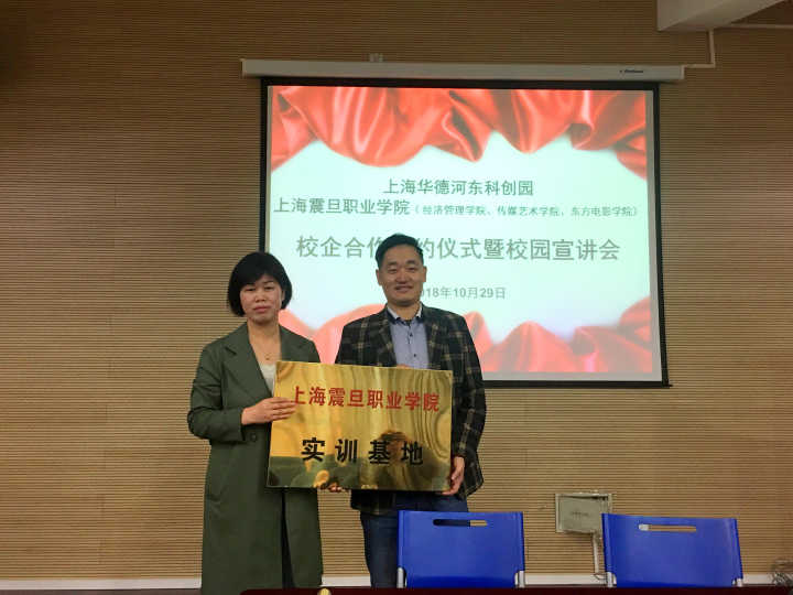 本次活動(dòng)由實(shí)踐教學(xué)辦公室主任葉素梅主持,經(jīng)濟(jì)管理學(xué)院胡守忠院長(zhǎng),傳媒藝術(shù)學(xué)院張繼平院長(zhǎng),東方電影學(xué)院祝華東副院長(zhǎng)及華德集團(tuán)陳江總裁,華德河?xùn)|科創(chuàng)園杜國(guó)興園長(zhǎng)等參加了活動(dòng)并現(xiàn)場(chǎng)簽訂合作協(xié)議。葉素梅主任代表學(xué)校授予華德科創(chuàng)園“上海震旦職業(yè)學(xué)院實(shí)訓(xùn)基地”銅牌。