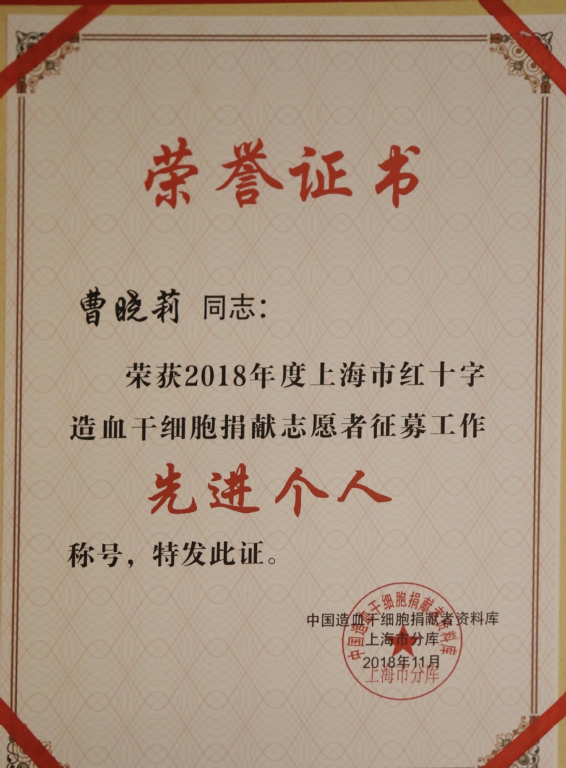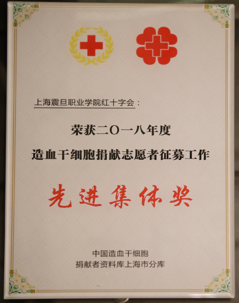 2018年12月5日,由上海市紅十字會(huì)、共青團(tuán)上海市委員會(huì)、上海市青少年服務(wù)和權(quán)益保護(hù)辦公室主辦的“為了生命的希望工程”2018年上海市青年造血干細(xì)胞捐獻(xiàn)志愿者集中行動(dòng)在上海交通大學(xué)醫(yī)學(xué)院附屬第九人民醫(yī)院舉行。會(huì)上,集中表彰了2018年造血干細(xì)胞捐獻(xiàn)宣傳動(dòng)員工作先進(jìn)集體和個(gè)人,我校榮獲“2018年度造血干細(xì)胞捐獻(xiàn)志愿者征募工作先進(jìn)集體”,我校團(tuán)委書記曹曉莉老師榮獲“2018年度上海市紅十字造血干細(xì)胞捐獻(xiàn)志愿者征募工作先進(jìn)個(gè)人”。截止目前,我校共有1624名青年師生志愿者加入中國(guó)造血干細(xì)胞捐獻(xiàn)者資料庫。志愿情懷,奔騰不息,我校師生用實(shí)際行動(dòng)向社會(huì)和公眾展現(xiàn)了震旦人高尚的精神品格和價(jià)值追求。