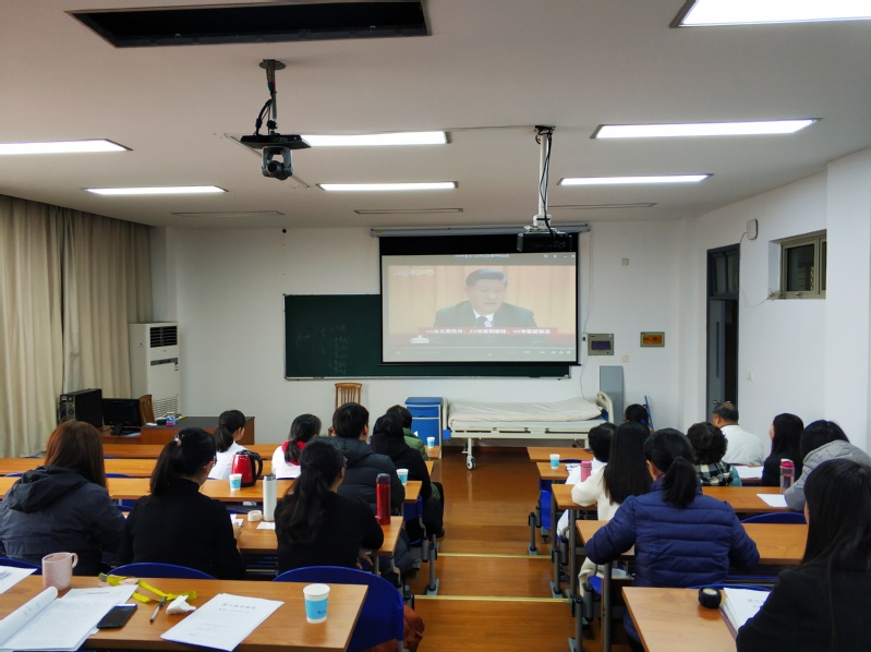 黨委中心組在學(xué)院會議室集中收看直播,各二級學(xué)院組織師生在各自辦公室和教室收看,還有通過手機觀看直播。下午上課的教師,在上課時也及時向同學(xué)宣講了大會的內(nèi)容。