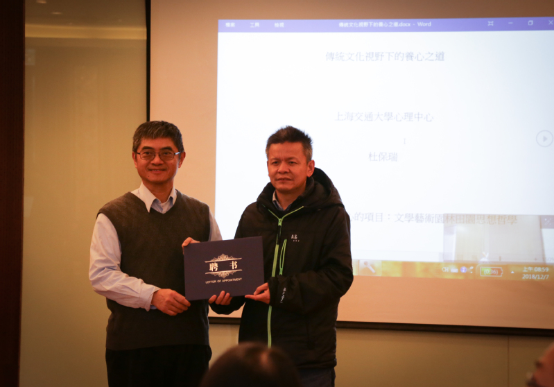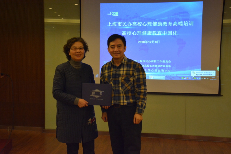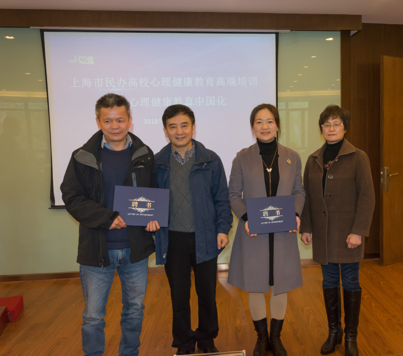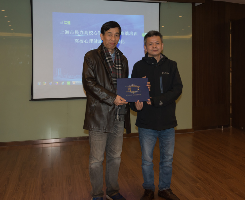 上海震旦職業(yè)學(xué)院黃晞建書記和夏臻副書記為上海交通大學(xué)心理咨詢中心楊文圣主任和汪國琴副主任頒發(fā)聘書。