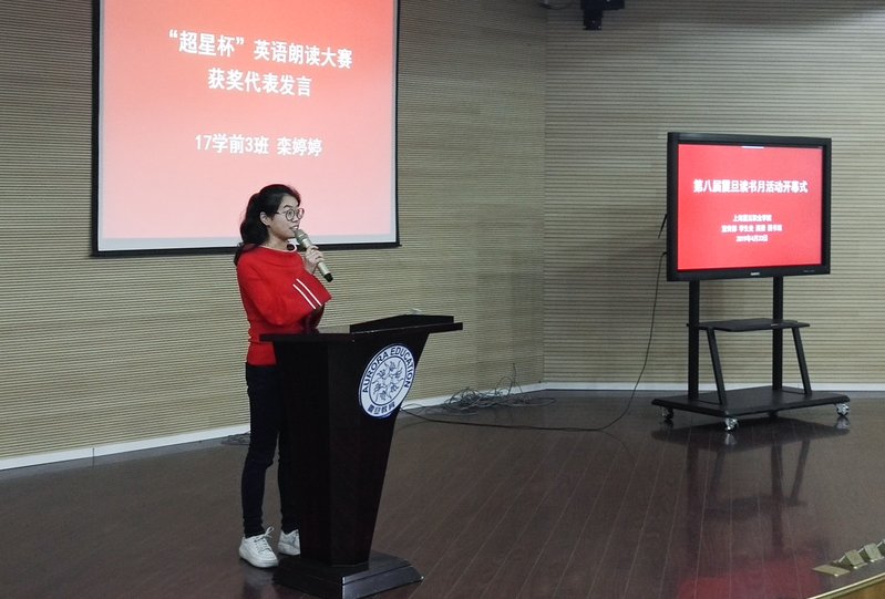 獲得英語朗讀大賽一等獎(jiǎng)的17學(xué)前3班欒婷婷同學(xué)作為學(xué)生代表發(fā)言,她分享了英語學(xué)習(xí)的有關(guān)經(jīng)驗(yàn),鼓勵(lì)同學(xué)們克服惰性,利用收聽英語廣播、練習(xí)配音、加入朗讀小組等方法勤加磨煉,逐步提高。