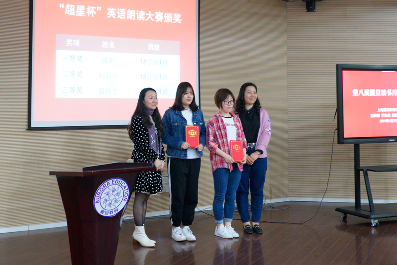 張惠莉理事長、基礎(chǔ)部萬華主任等領(lǐng)導(dǎo)及嘉賓隨后分別為震旦學(xué)院“超星杯”英語朗讀大賽決賽中獲得一、二、三等獎(jiǎng)的同學(xué)頒發(fā)獎(jiǎng)狀和獎(jiǎng)品。