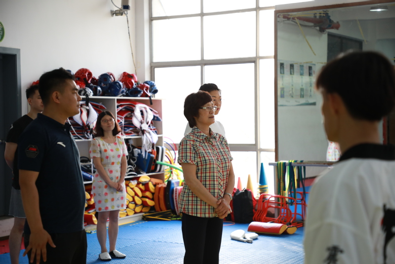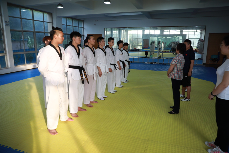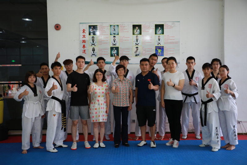 2019年6月5日下午五點半,就像幾百個日常訓(xùn)練中的一天一樣,體藝樓一樓外就能聽到跆拳道隊訓(xùn)練所發(fā)出的吶喊聲和響亮的腳靶擊打聲。當(dāng)天黨委副書記夏臻老師,黨委組織部部長黃敏老師,學(xué)生處處長毛燕靜老師,前往跆拳道館看望正在積極備戰(zhàn)全國大學(xué)生跆拳道錦標(biāo)賽的隊員們。