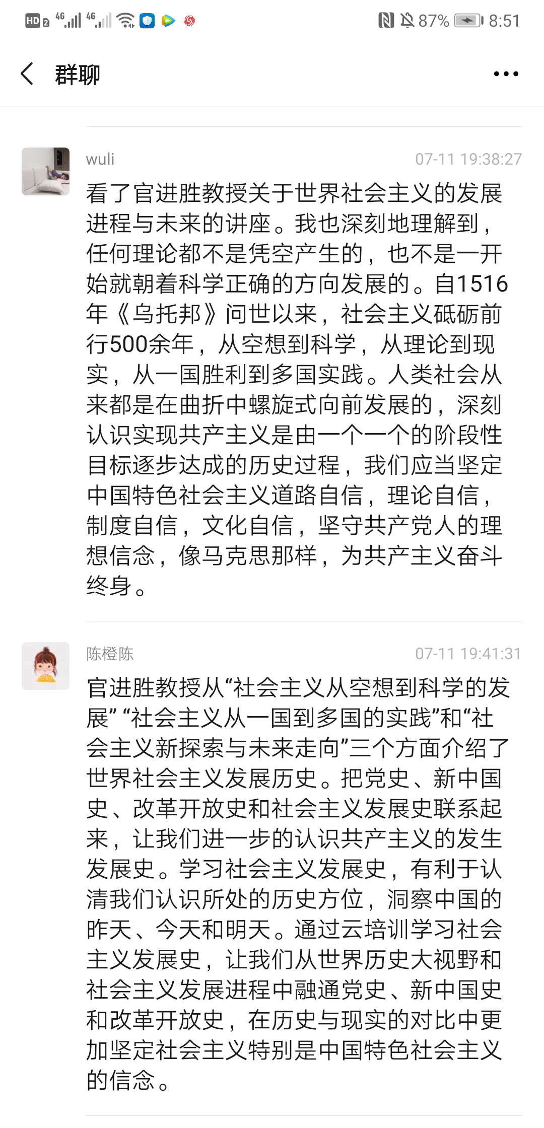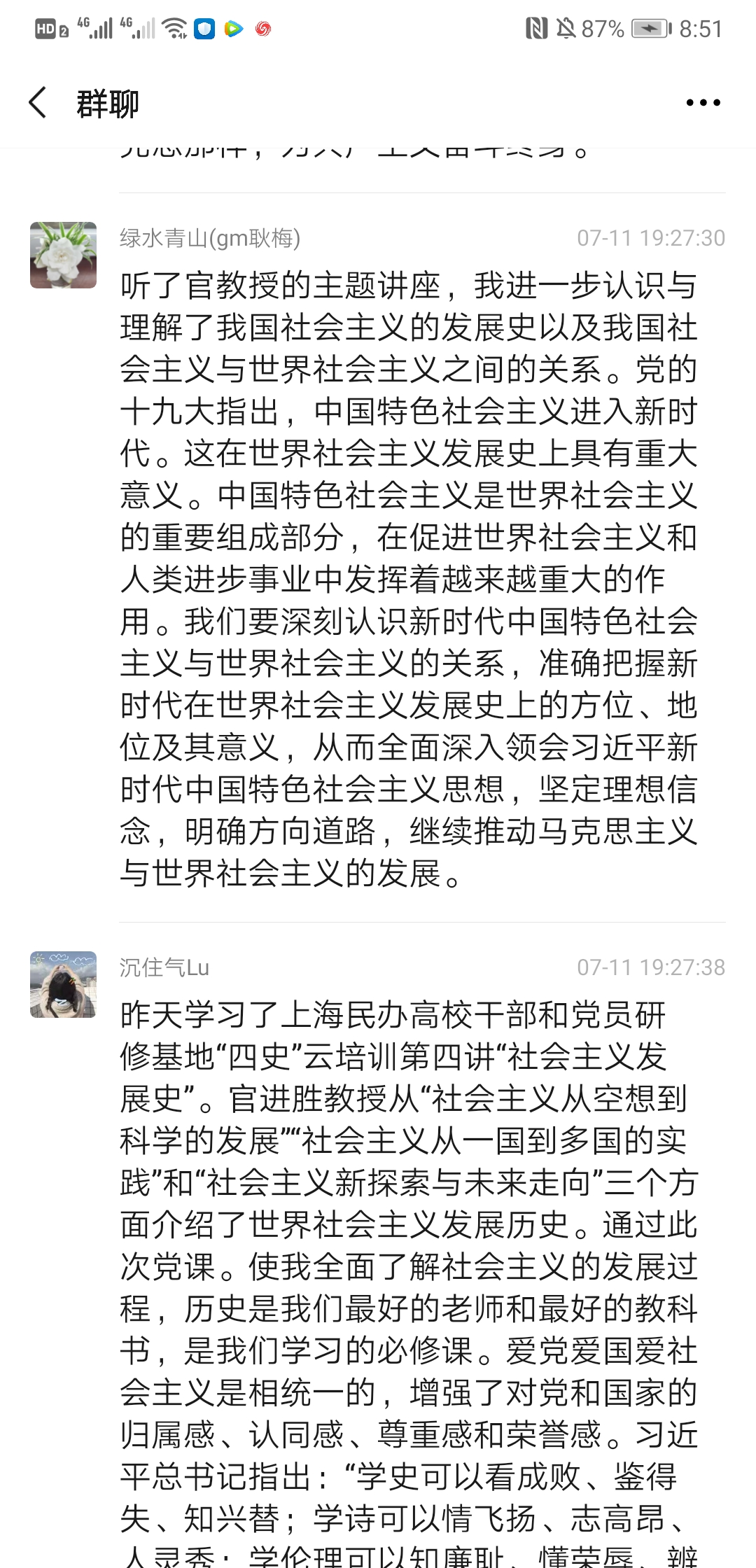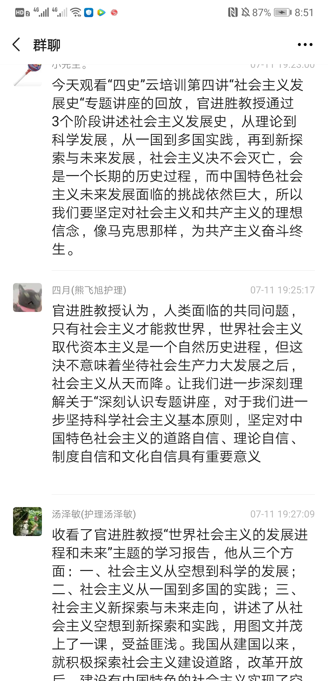 2020年7月10日上午9:30,上海民辦高校干部和黨員研修基地“四史”云培訓(xùn)第四講“世界社會主義的發(fā)展進(jìn)程與未來”專題講座準(zhǔn)時開講,主講人是上海市委黨??茖W(xué)社會主義教研部主任官進(jìn)勝教授。為加強(qiáng)師生黨員同志對社會主義發(fā)展史的認(rèn)識和理解,公共衛(wèi)生與護(hù)理學(xué)院黨總支組織所有師生黨員收看了官教授的講座,并于11日晚19:00-20:00開展了一次線上研討會,共同探討本次講座的學(xué)習(xí)心得與體會,師生黨員同志們系統(tǒng)地回顧了世界社會主義的發(fā)展歷程,進(jìn)一步加深了對社會發(fā)展規(guī)律的認(rèn)識,增強(qiáng)了對中國走社會主義道路的決心和信心,對世界社會主義的美好前景充滿期待。以下是部分同志發(fā)言記錄: