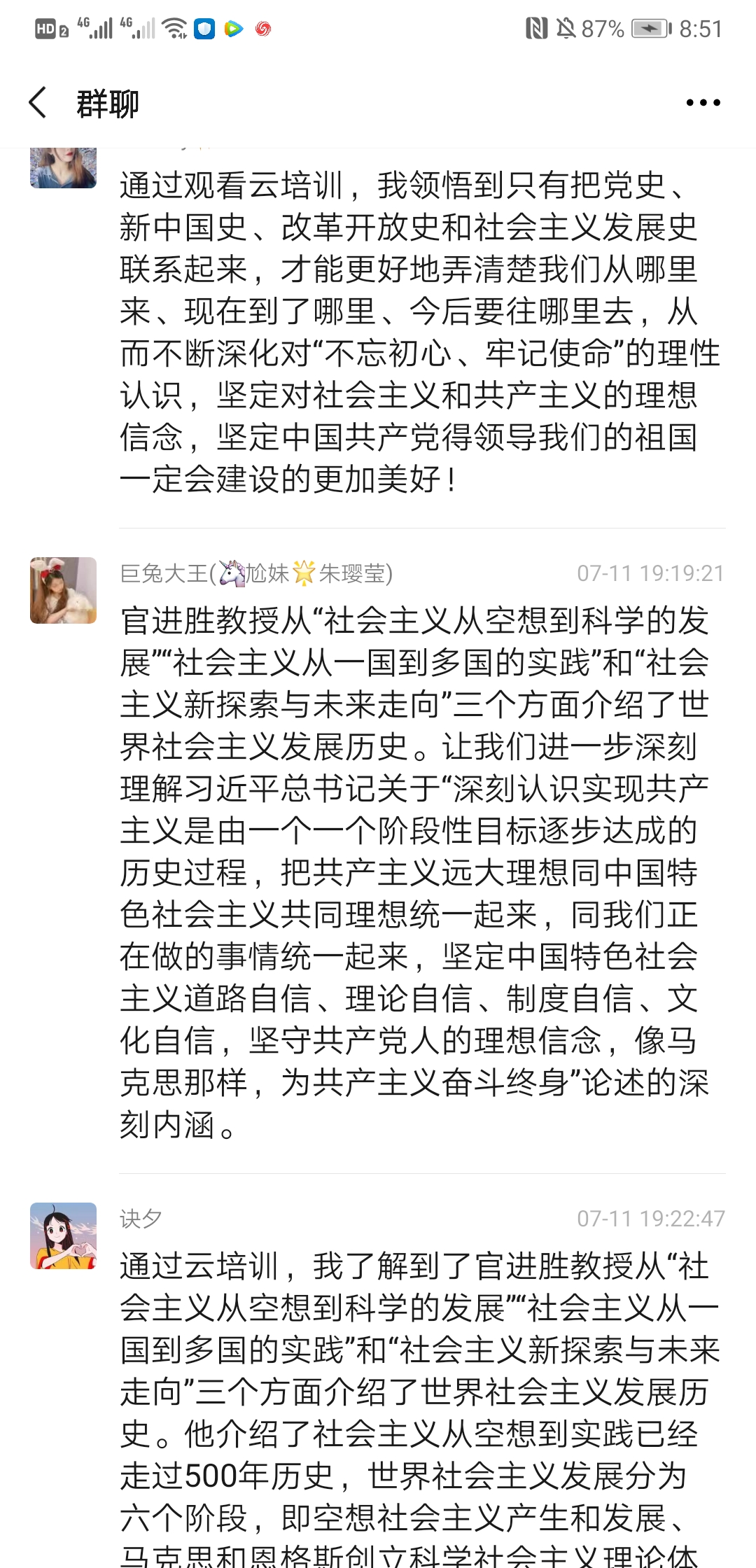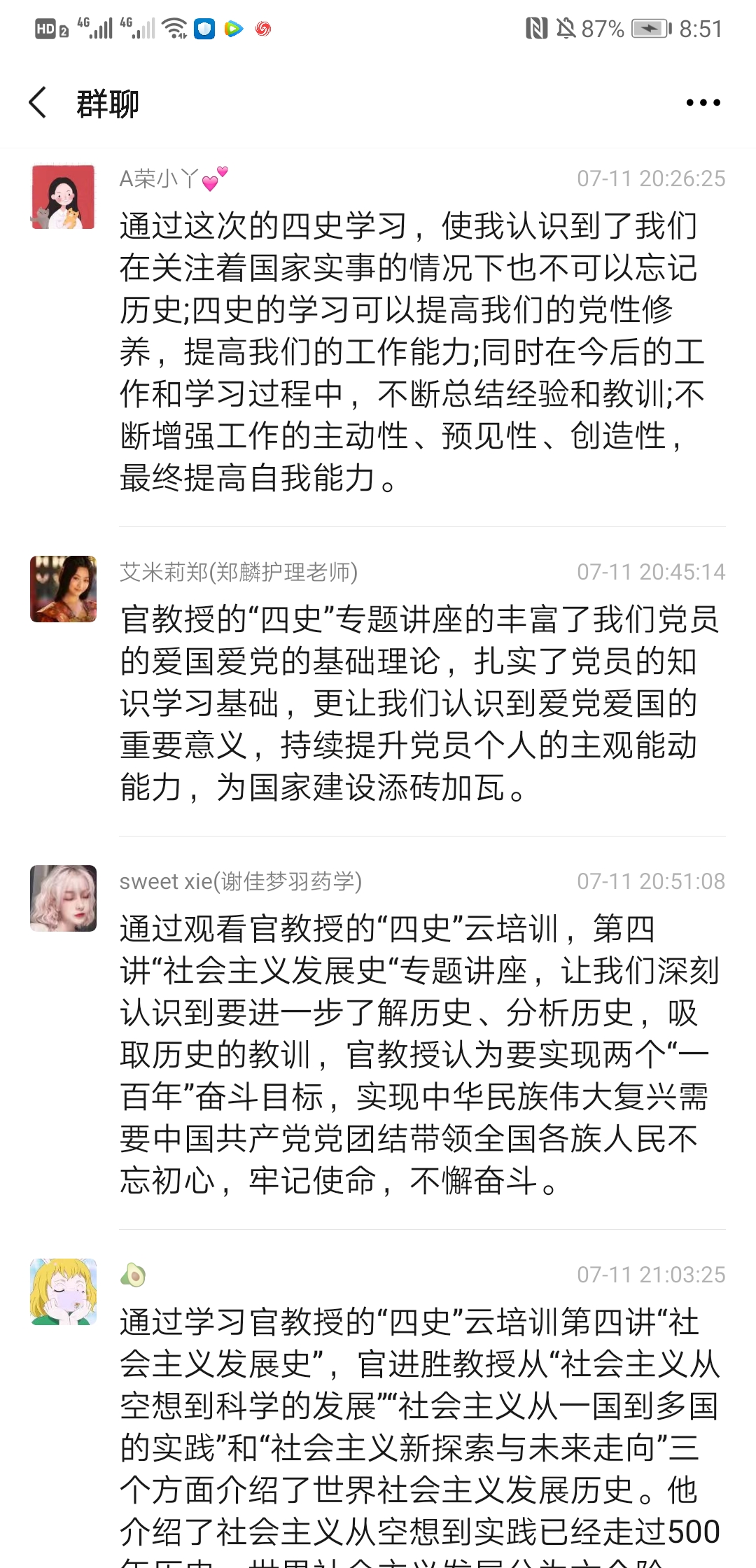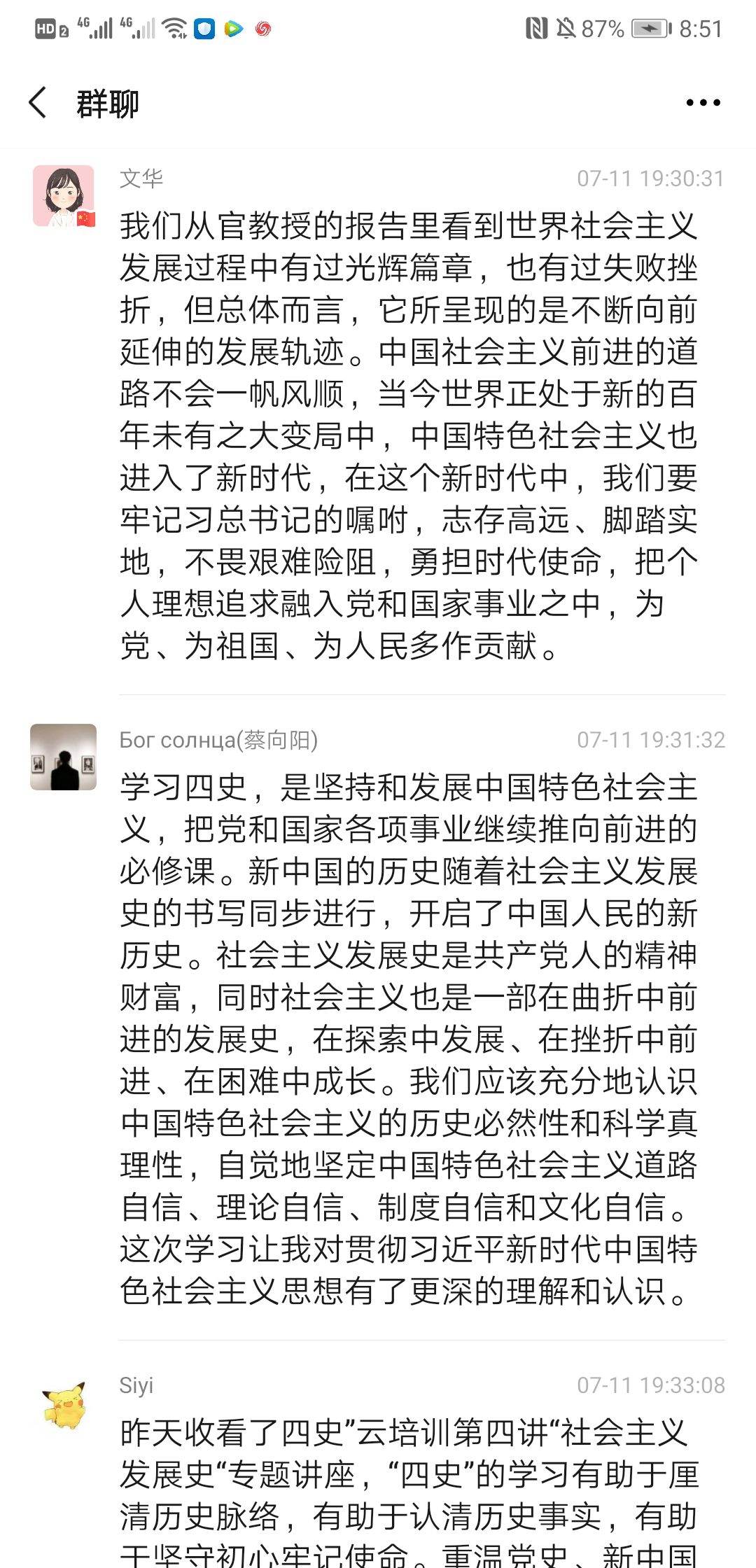 2020年7月10日上午9:30,上海民辦高校干部和黨員研修基地“四史”云培訓(xùn)第四講“世界社會主義的發(fā)展進(jìn)程與未來”專題講座準(zhǔn)時開講,主講人是上海市委黨??茖W(xué)社會主義教研部主任官進(jìn)勝教授。為加強(qiáng)師生黨員同志對社會主義發(fā)展史的認(rèn)識和理解,公共衛(wèi)生與護(hù)理學(xué)院黨總支組織所有師生黨員收看了官教授的講座,并于11日晚19:00-20:00開展了一次線上研討會,共同探討本次講座的學(xué)習(xí)心得與體會,師生黨員同志們系統(tǒng)地回顧了世界社會主義的發(fā)展歷程,進(jìn)一步加深了對社會發(fā)展規(guī)律的認(rèn)識,增強(qiáng)了對中國走社會主義道路的決心和信心,對世界社會主義的美好前景充滿期待。以下是部分同志發(fā)言記錄: