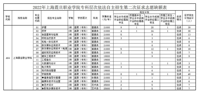 2022年上海市部分普通高校??茖哟我婪ㄗ灾髡猩?jīng)第一次征求志愿投檔錄取后,尚有部分招生院校未完成招生計劃。未錄取考生可于5月7日(星期六)9:00-14:00期間,登錄“上海招考熱線”網(wǎng)站(www.shmeea.edu.cn)填報第二次征求志愿。《第二次征求志愿填報專業(yè)計劃缺額表》將于志愿填報前在“上海招考熱線”網(wǎng)站公布,請考生及時關(guān)注。我校第二次征求志愿具體詳見下表: