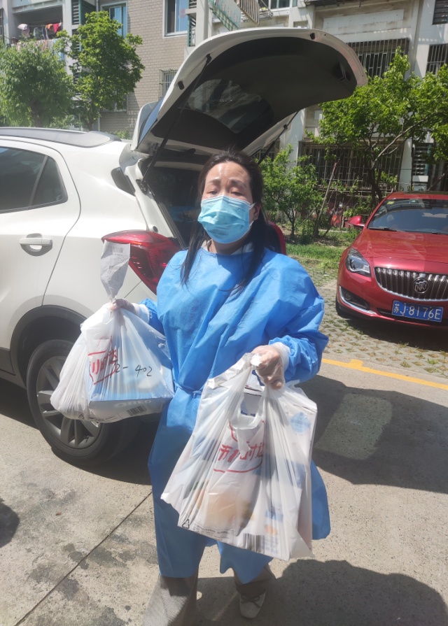 志愿者1:黃梅玲老師,為所在小區(qū)做物資配送志愿者服務(wù)。物資到小區(qū)門口后,進行消殺,等待半個小時,再從小區(qū)門口運送至每戶門洞樓下。志愿者2:王歡老師,主要負責(zé)在小區(qū)巡邏,讓居民做到足不出戶,下午在核酸排隊時拉警戒線,控制人流,督促居民們間隔一米,準(zhǔn)備好二維碼;其次負責(zé)物資的裝卸工作,并在晚上送到每一戶居民的家中。