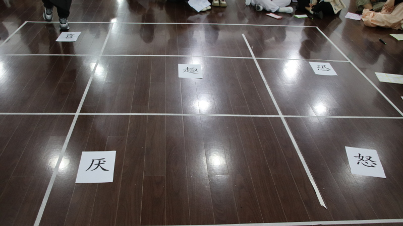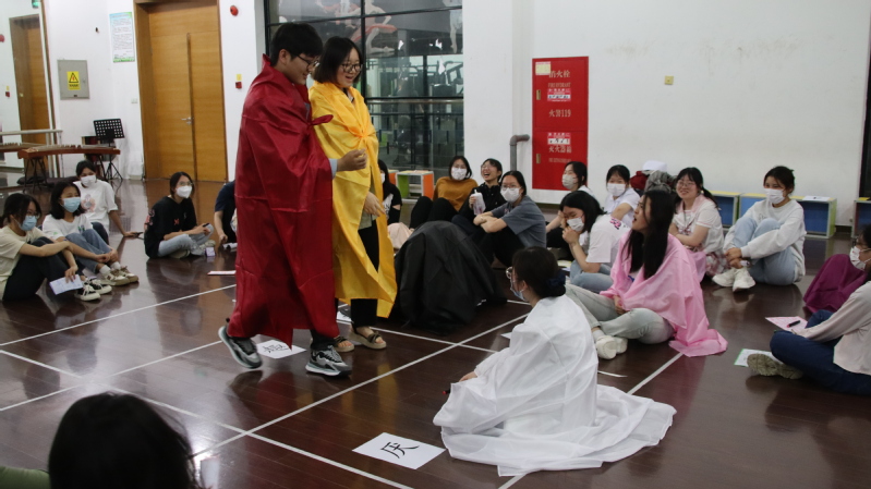 活動的第二部分,由輔導(dǎo)老師選取一個在大學(xué)生活中比較常見的宿舍矛盾問題為切入點,讓一組同學(xué)進(jìn)入角色扮演,分別代表喜、怒、恐、哀、趣五種情緒狀態(tài),其他同學(xué)進(jìn)行觀察記錄。借助不同顏色代表不同情緒狀態(tài)的披風(fēng),參與角色扮演的同學(xué)自編自導(dǎo)自演,將宿舍矛盾產(chǎn)生的過程及每個同學(xué)的內(nèi)部心理活動展示出來。