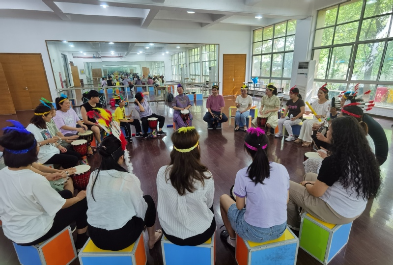 隨后,聶老師進入鼓圈中間,通過節(jié)奏、分聲部、三點雷達等技術引導輔導員們體驗鼓圈的團隊精神和節(jié)奏魅力。聶老師還講解了非洲鼓的起源,并教大家演奏非洲鼓。來自新疆的夏依旦老師和林忠蘭老師在《掀起你的蓋頭來》的音樂中翩翩起舞,馬合木提老師打鼓伴奏,聶老師吹琴伴奏,將整個活動的氣氛推向了高潮。