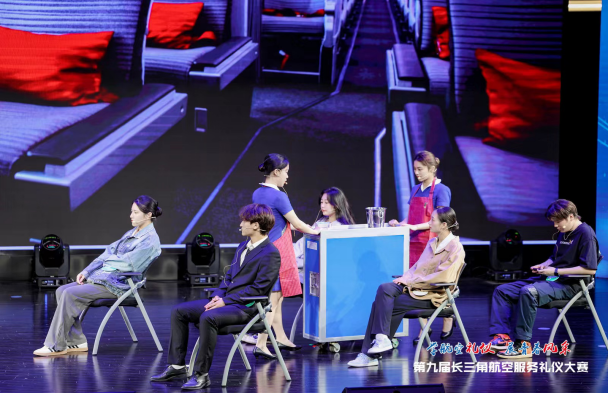 第三個環(huán)節(jié)是“展禮示儀”。震旦學(xué)子自行編排航空禮儀情景劇,展示在飛行中應(yīng)對問題的能力。他們生動演繹出航空服務(wù)人員如何在確保飛行安全的同時提高乘客的滿意度,贏得了評委和觀眾的陣陣掌聲。