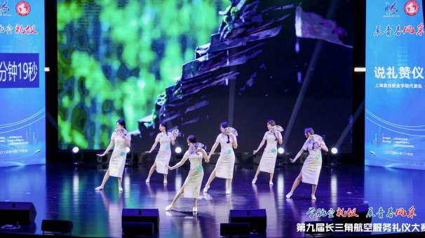 本次大賽分為四個環(huán)節(jié),第一個環(huán)節(jié)是“行禮立儀”。選手需集體展示航空基礎(chǔ)禮儀。賽場上,震旦學(xué)子們以自信和嫻熟的動作展示出航空服務(wù)的專業(yè)性和高標準。
