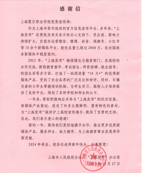 2023年12月27日,市政府辦公廳“上海發(fā)布”辦公室發(fā)來(lái)《感謝信》。信中提到,2023年,我校積極響應(yīng)并參與“上海發(fā)布”的欄目征集、新媒體產(chǎn)品策劃,投送了許多主題鮮明、富有特色的素材,為“上海發(fā)布”做好滬上高校宣傳推介提供了寶貴的支持。揮手告別2023,未來(lái)的日子里,我們將繼續(xù)積極主動(dòng)、通力合作,講好震旦故事,傳遞震旦聲音,助力上海教育事業(yè)發(fā)展。