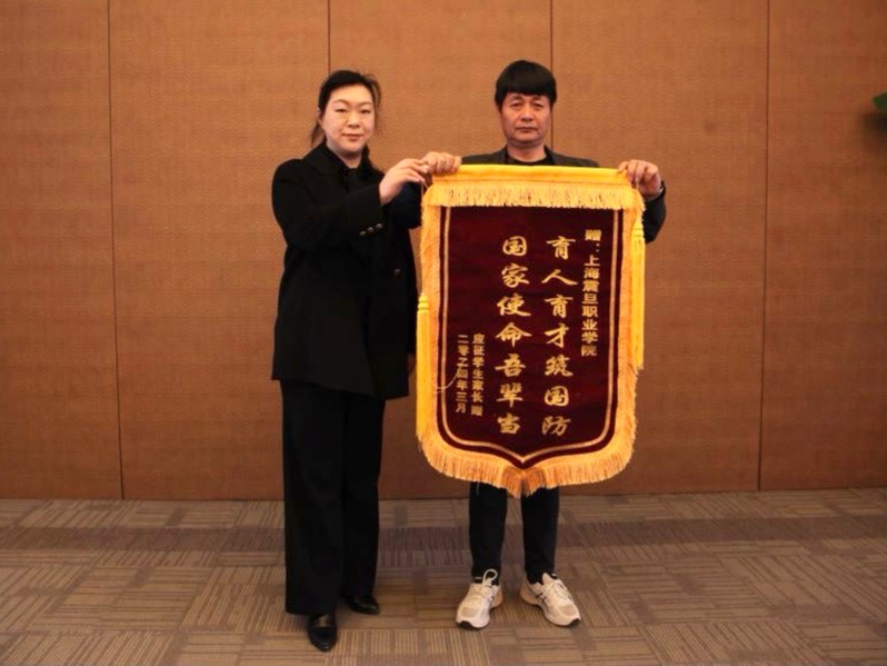 劉伯虎的父親代表新兵家長向?qū)W校贈送錦旗,感謝學(xué)校的培育之恩。