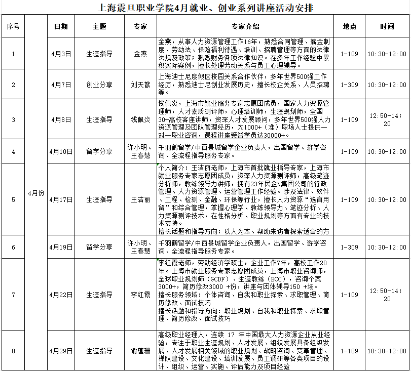 為積極應對當前就業(yè)市場的挑戰(zhàn),提升青年學子的就業(yè)創(chuàng)業(yè)能力,上海震旦職業(yè)學院就業(yè)指導中心、創(chuàng)新創(chuàng)業(yè)學院將于4月舉辦就業(yè)創(chuàng)業(yè)系列講座,通過專家解讀、案例分析、互動交流等多種形式,為廣大學子提供實用的就業(yè)創(chuàng)業(yè)指導。