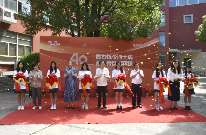 吳松書記宣布“震旦教育四十周年校史展暨藝術(shù)作品展開幕”后,領(lǐng)導(dǎo)們?yōu)檎褂[剪彩開幕。