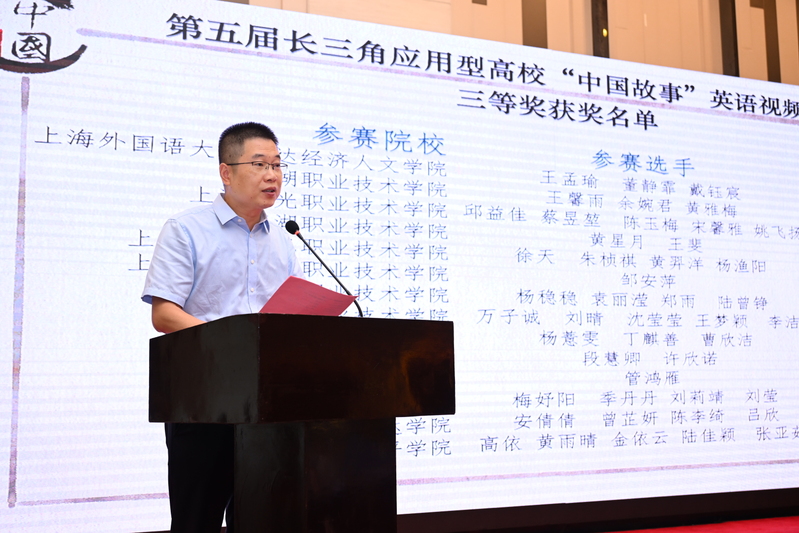 上海外國語大學(xué)張健教授、蘇州科技大學(xué)祝平教授、上海外國語大學(xué)賢達(dá)經(jīng)濟(jì)人文學(xué)院馮奇教授、浙江金融職業(yè)學(xué)院凌來芳教授、安徽國際商務(wù)職業(yè)學(xué)院國際教育學(xué)院院長秦慈楓教授、上海市外文學(xué)會高職高專外語教學(xué)專業(yè)委員會主任陳文杰教授等專家宣讀了“第四屆長三角應(yīng)用型高?!袊适隆處熡⒄Z微課大賽”獲獎名單、“第五屆長三角應(yīng)用型高?!袊适隆⒄Z視頻大賽”獲獎名單、優(yōu)秀指導(dǎo)教師獎和優(yōu)秀組織獎。