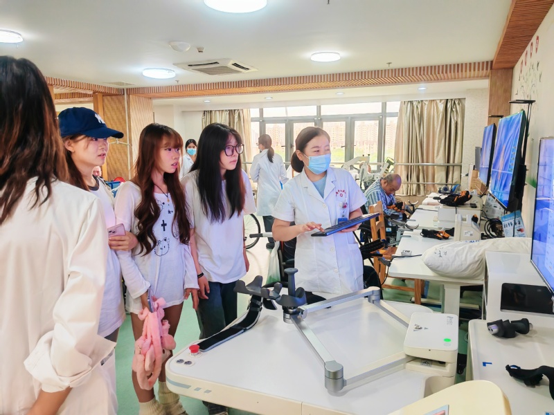隨后,涂部長(zhǎng)又帶領(lǐng)同學(xué)們參觀了高壓氧艙、重癥監(jiān)護(hù)病房、運(yùn)動(dòng)治療區(qū)、兒童康復(fù)區(qū)、以及普通病區(qū)等多個(gè)區(qū)域。每到一個(gè)參觀區(qū)域,區(qū)域負(fù)責(zé)人都會(huì)向同學(xué)們?cè)敿?xì)介紹科室康復(fù)治療的設(shè)施和發(fā)展?fàn)顩r,并現(xiàn)場(chǎng)示范各種康復(fù)設(shè)備的使用方法。同學(xué)們也積極與老師進(jìn)行互動(dòng),及時(shí)向老師提問,受益匪淺。