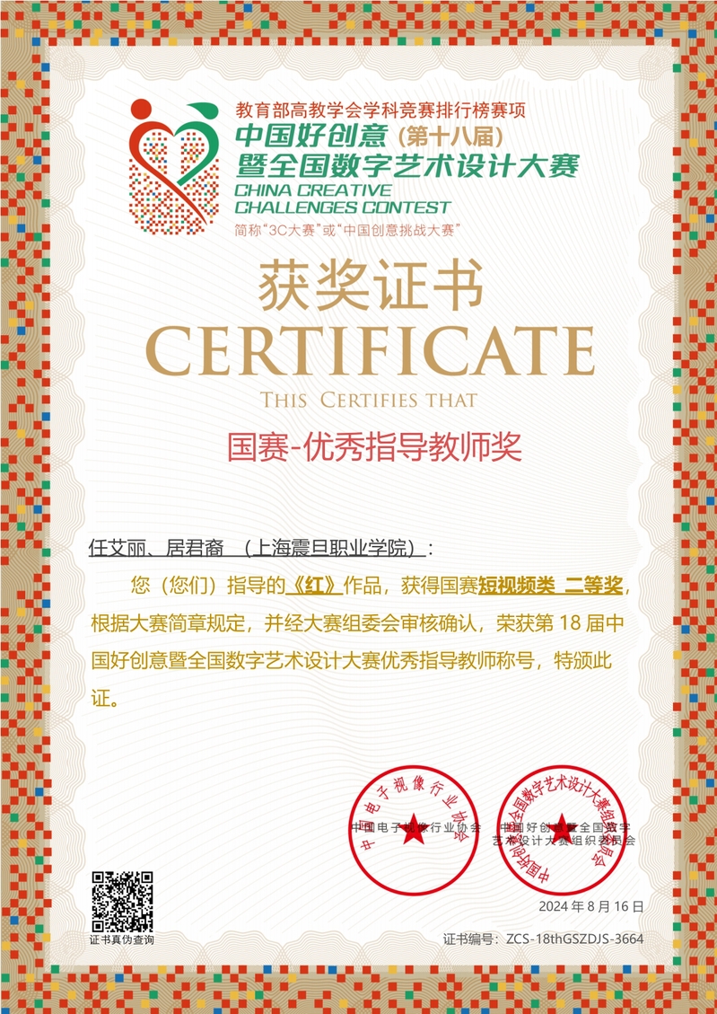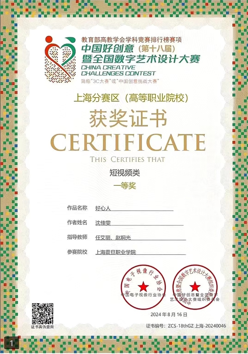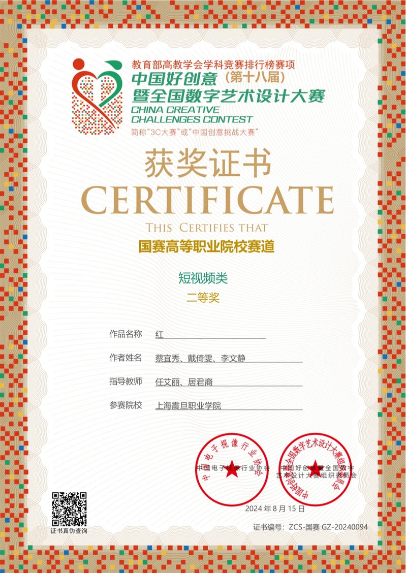 近日,第18屆中國好創(chuàng)意暨全國數(shù)字藝術(shù)設(shè)計(jì)大賽結(jié)果揭曉。我校東方電影學(xué)院影視編導(dǎo)專業(yè)蔡宜秀、戴倚雯同學(xué)和攝影攝像技術(shù)專業(yè)的李文靜同學(xué)共同創(chuàng)作的影視作品《紅》榮獲“國賽高等職業(yè)院校賽道”短視頻類二等獎(jiǎng);指導(dǎo)老師任艾麗、居君裔榮獲“優(yōu)秀指導(dǎo)教師”獎(jiǎng)。攝影攝像技術(shù)專業(yè)的沈佳雯同學(xué)憑借影視作品《好心人》(指導(dǎo)老師任艾麗、趙炯光)在上海分賽區(qū)短視頻類比賽中斬獲一等獎(jiǎng)。