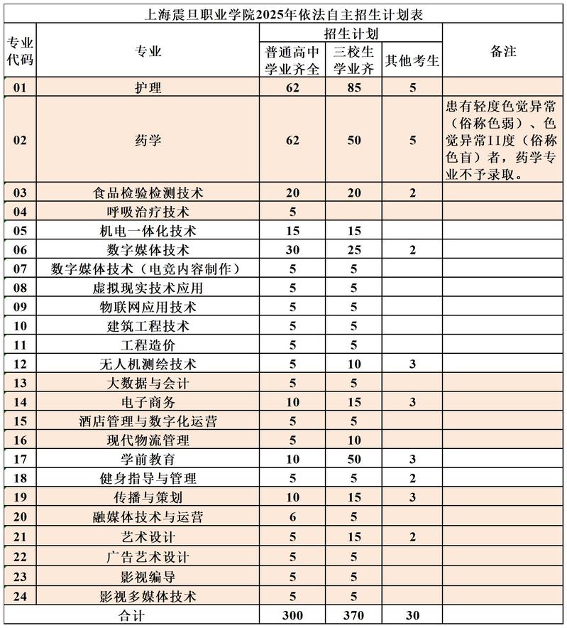 上海震旦職業(yè)學(xué)院2025年依法自主招生計劃表